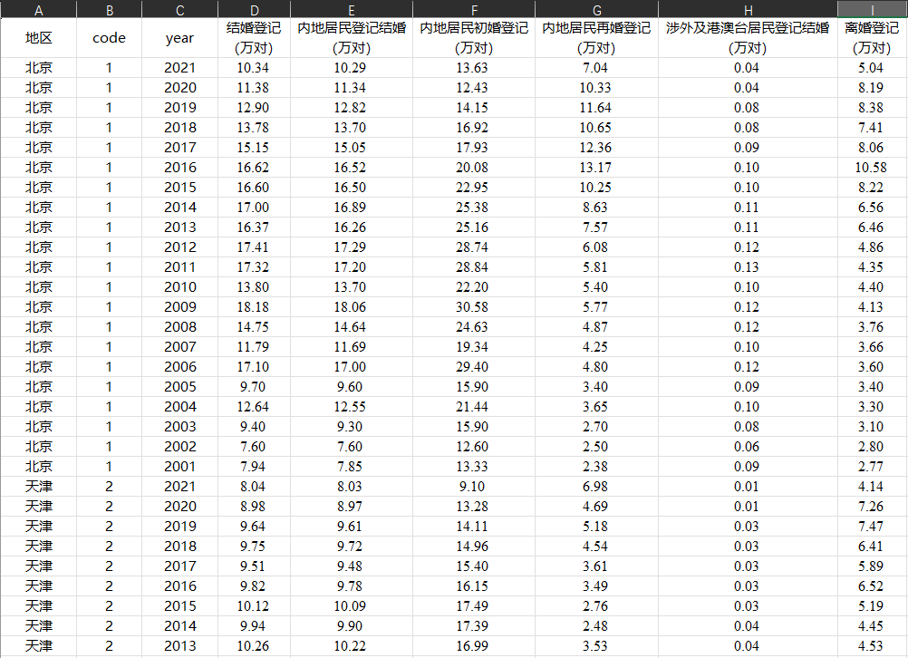 指标:结婚登记数、内地居民登记结婚数、内地居民初婚登记数、