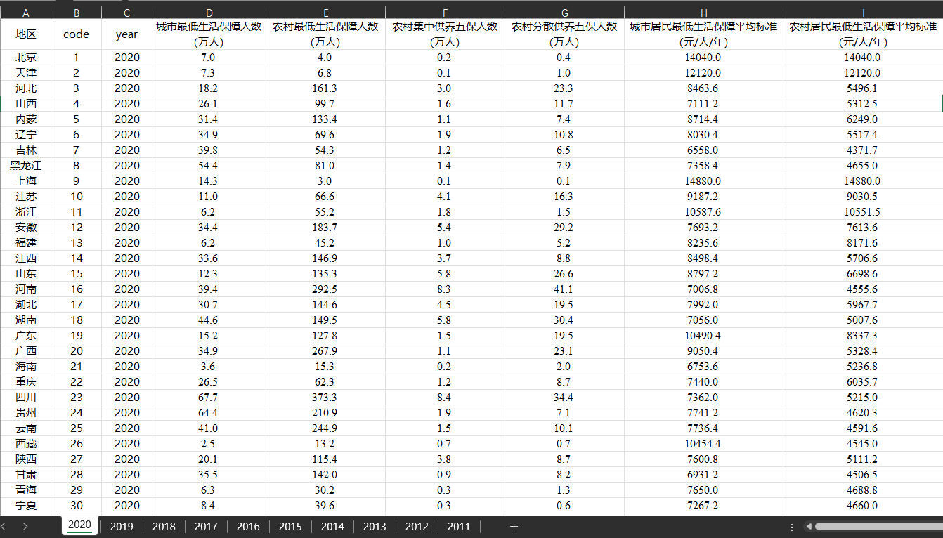 指标:城市最低生活保障人数、农村最低生活保障人数、农村集中供养五保人数、农村分散供养五保人数