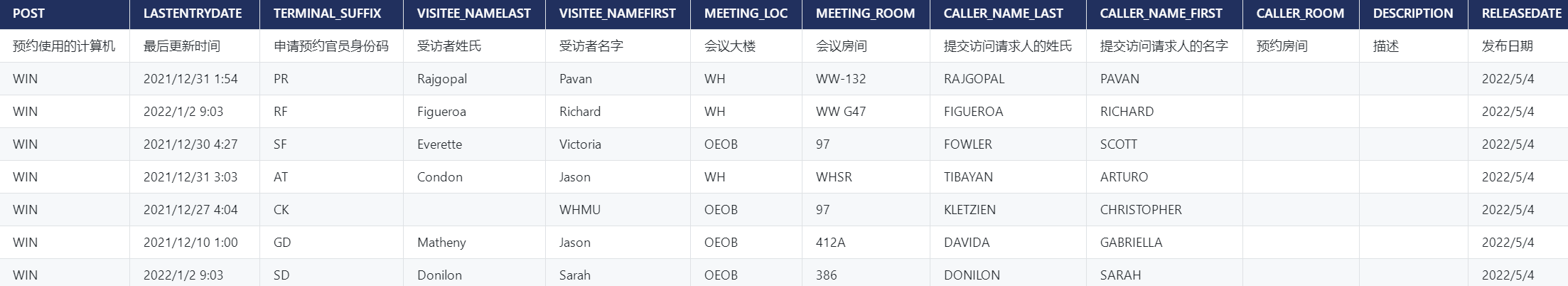 白宫访客日志数据,包含访客姓名、受访者姓名、到达与离开时间、到访具体位置等详细信息,为相关研究提供数据支持。
