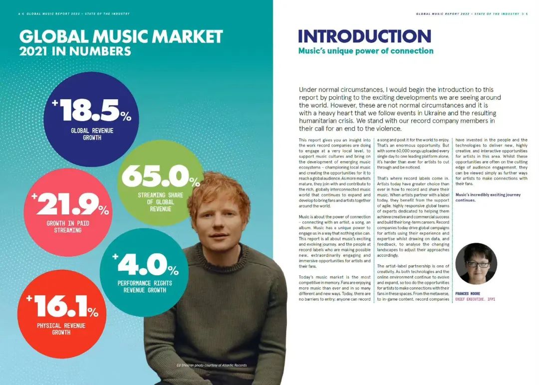 但是,新媒介只会毁灭唱片行业,不会毁灭音乐行业。按IFPI的《全球音乐报告2022》,从2017年开始,全球流媒体音乐销售额首次超过了实体唱片销售额,占到音乐行业总收入38%,且继续保持高速增长,2021年占比达到65%,同年实体唱片萎缩到只占总收入19%,但2021年的总收入达到259亿美元,超过了1999年的数据。
