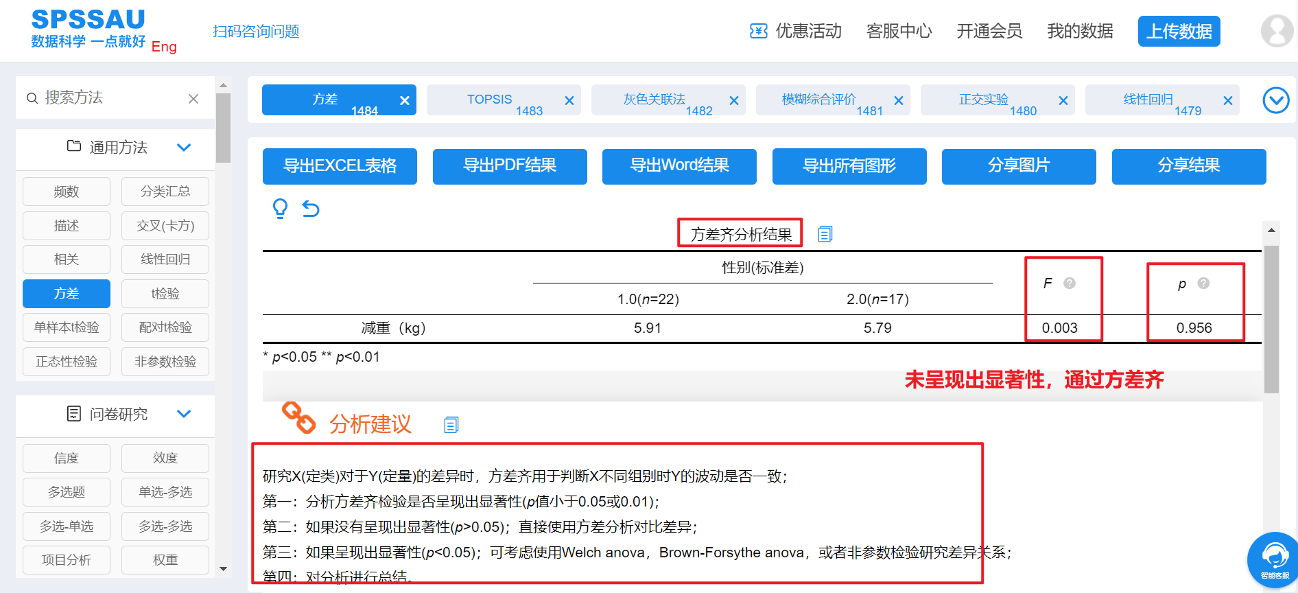F检验对应p值大于0.05,说明方差齐,否则方差不齐。可参考SPSSAU方差齐分析结果