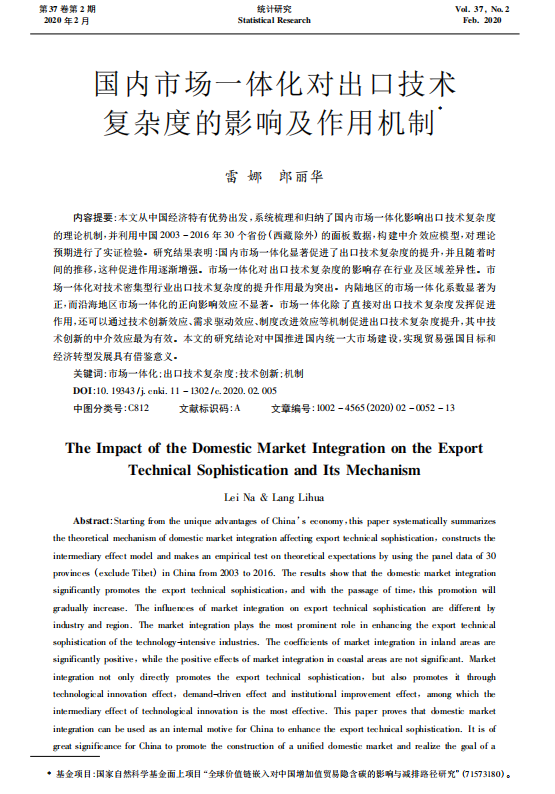 雷 娜 , 郎丽华 . 国内市场一体化对出口技术复 杂度的影响及作用机制[J]. 统计研究, 2020,37(02):52-56