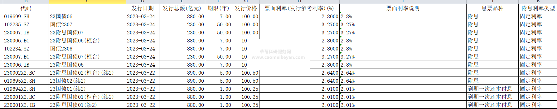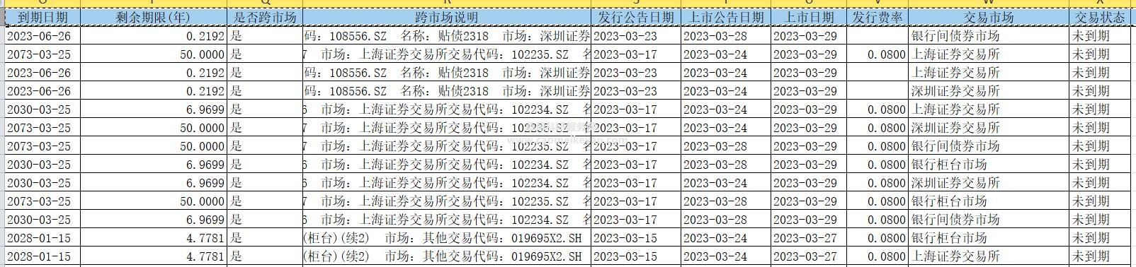 2.数据范围:序号 代码 国债名称 发行日期 发行总额(亿元) 期限(年) 发行价格 票面利率(发行参考利率)(%) 票面利率说明 息票品种 附息利率类型 付息频率 起息日期 付息日说明 到期日期 剩余期限(年) 是否跨市场 跨市场说明 发行公告日期 上市公告日期 上市日期 发行费率 交易市场 交易状态