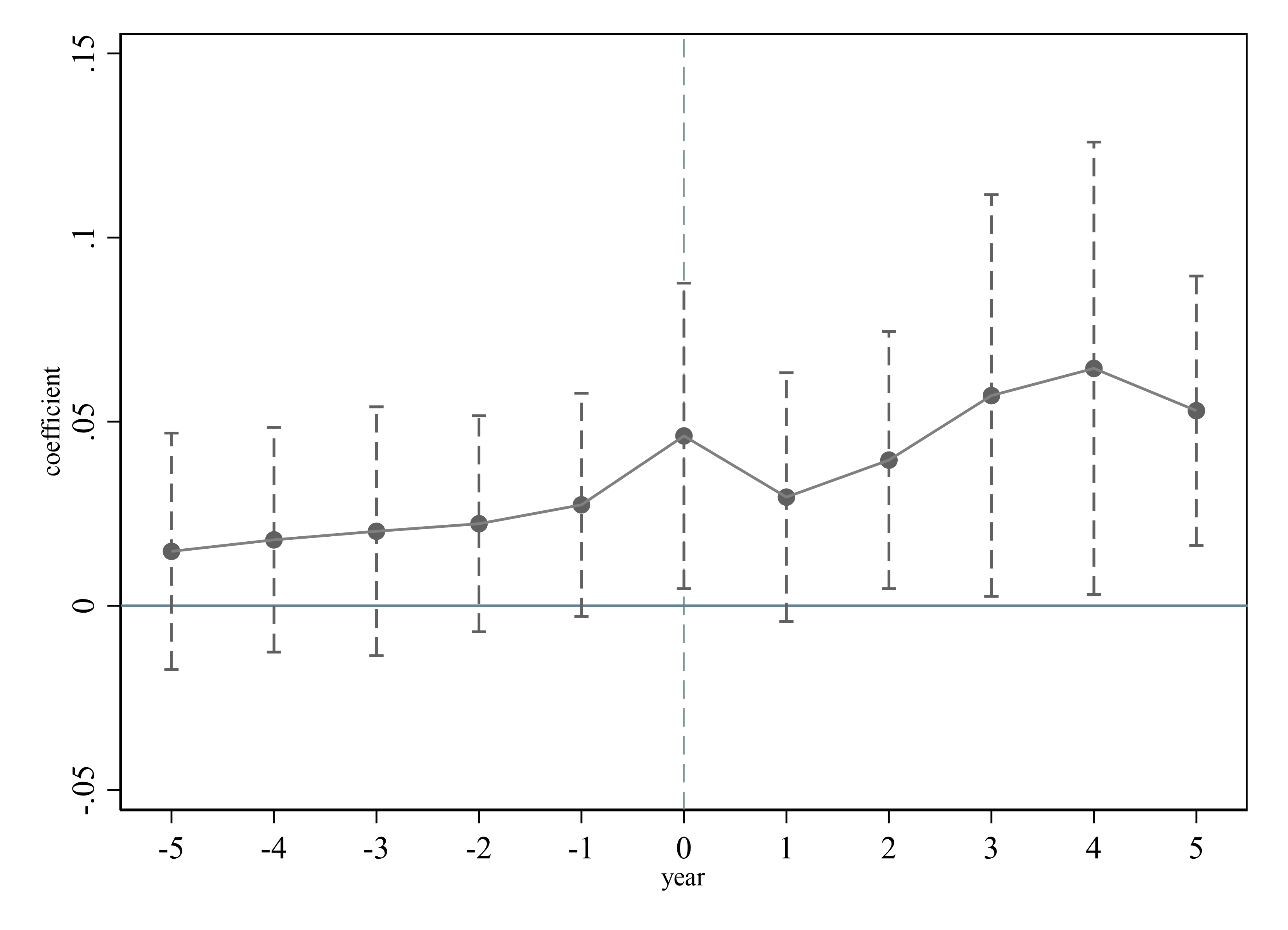 如图,平行趋势检验算是通过了吗?图中政策发生期前就呈上升趋势,会不会存在年轮效应?如果存在年轮效应,可以怎么调整呢?