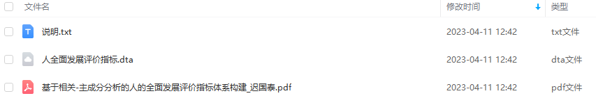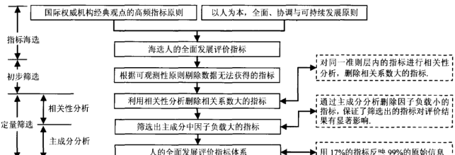 本文先从经济、社会、生活质量和人口素质四个方面海选了众多人的全面发展评价指标,然后根据可观测性原则剔除无法获得的指标进行了初步筛选,再利用相关性分析删除相关系数大的指标,以及通过主成分分析删除因子负载小的指标,完成了定量筛选,最终构建了由14个变量组成的评价指标体系,利用17%的指标反映了99%的原始信息。