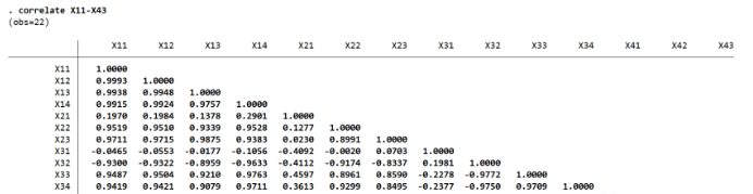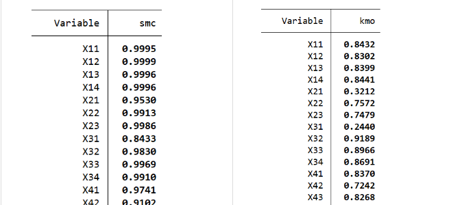 先对变量进行相关性分析,得到所有变量之间的方差-协方差矩阵。可以发现很多变量之间的相关关系是非常强的甚至有的超过了90%,这说明变量之间存在着相当数量的信息重叠。并且SMC与KMO检验得到的结果表明变量的线性关系很强。进行主成分分析把众多的初始变量整合成少数几个相互之间无关的主成分变量是非常必要的。