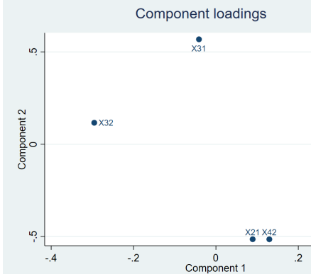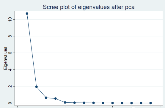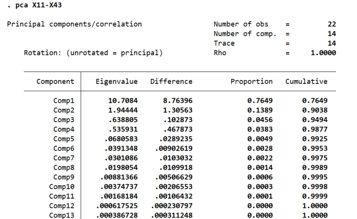 结果可以发现,stata总共提取了14个主成分。可以发现第一个主成分的方差贡献率是0.7649,表示该主成分解释了所有变量的76.49%的信息。