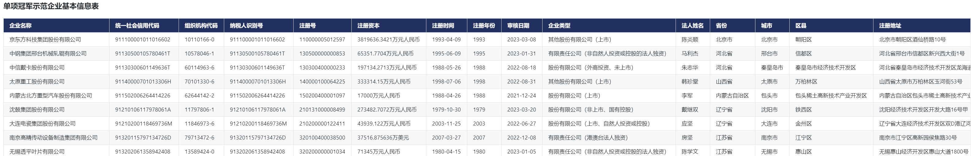 在中国工商注册基础信息数据中整理出我国2016-2022年间合计7批制造业单项冠军企业的工商注册企业基本信息,覆盖企业名称、工商注册号、注册时间、注册地址、公司状态、行业分类名称及代码、企业简介、经营范围等字段 。