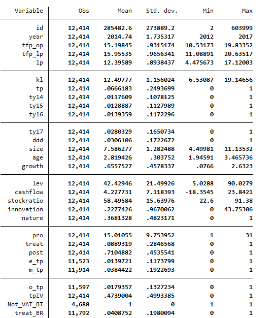 其中,i和j分别表不企业、年份和省份;叩骸at仍zg表木企业升级水平,具体以OP法和LP法计算的全要素生产率(加_op、加_Zp )表示,在稳健性测试部分替换为企业劳动生产率(饥);treat为企 业分组变量,如of等于1代表处理组,等于0代表控制组;post为时间分组变量,2012—2013年取值 为0,2014—2017年取值为1。
