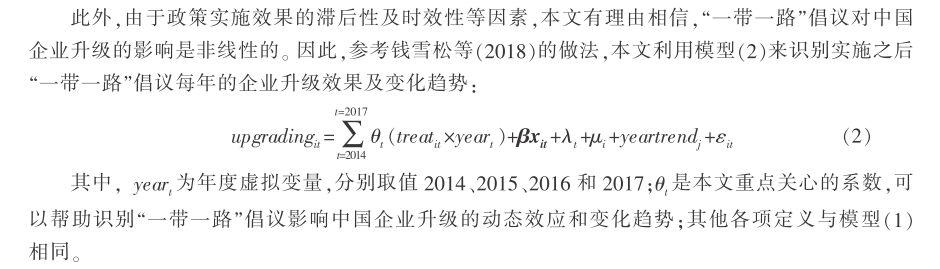 近年来,中国应该如何实现产业升级受到学界的广泛关注,产业升级归根结 底是产业内代表性企业是否实现优化升级,“一带一路”倡议在中国经济进入新常态的背 景下提出,其对中国企业升级的影响具有重要的意义。