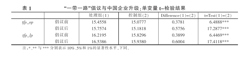 汇报了变量猝_Zp的单变量分析结果,可以看出,处理组和控制组企业的加_Zp在“一带一路”倡议前后的变化情况与变量挣的基本相符。以上信息说明,“一带一 路”倡议确实对处理组企业的升级水平起到了正向作用,拉大了处理组和控制组之间企业升级水平 的差距,但这种差距是否在统计上显著还需利用DID模型进行进一步检验。