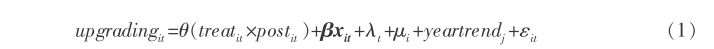 为了避免投资目的国为沿线国家之外的企业对估计结果的干扰,本文将没有参与对外直接投资的企业作为控制组。在基准模型的设计上,本文根据DID模型的原理设计如下模型对“一带一路”倡议的企业升级 效应进行识别: