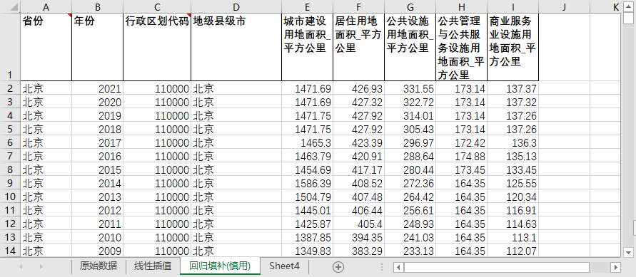 全国各地级市县级市居住公共设施管理商业服务城市建设用地面积2002-2021含无缺失值填补