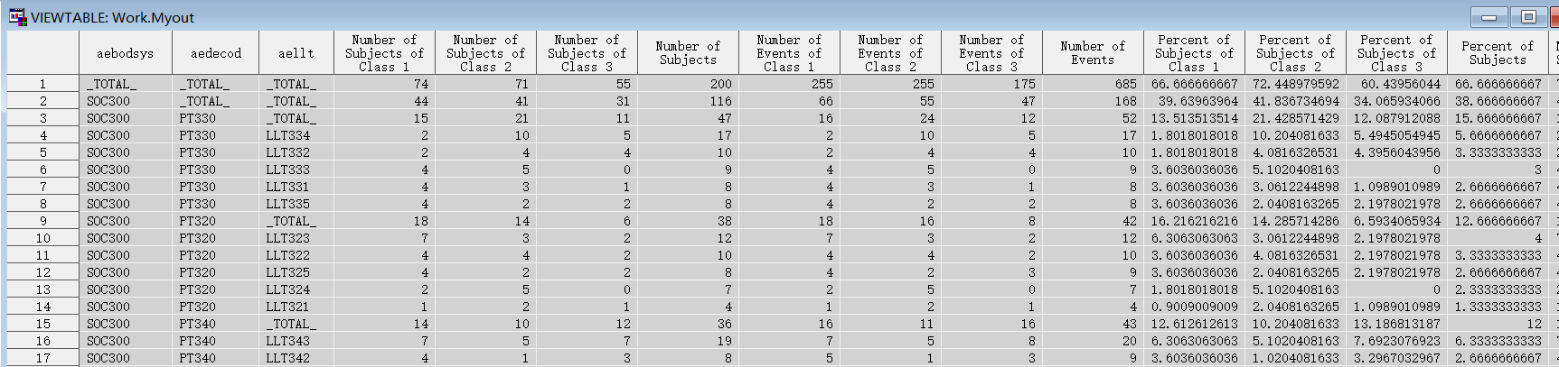2. 结果数据集中,例数(Number of Subjects)是当前分层组合下受试者(由SUBJECT=指定)去重后的计数,例次(Number of Events)是当前分层组合下受试者的直接计数;
