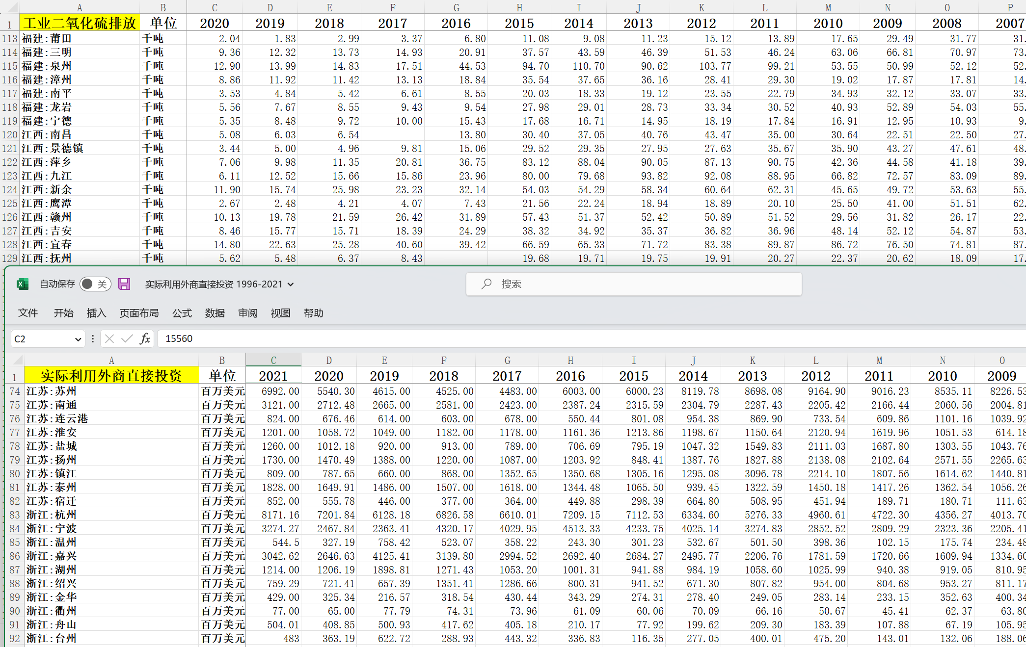 地级市 市级 各市 1996-2021年 二氧化硫排放 氮氧化物排放 实际利用外商直接投资