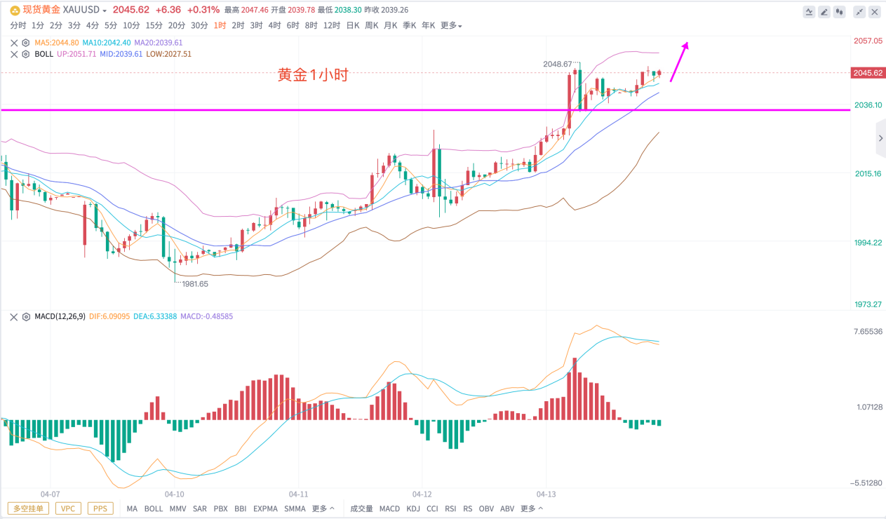 黄金,雄起只是时间问题,美国3月份cpi公布数据低于预期和前值,对于未来美联储加息的预期降温,非美货币不断不同程度上涨,CPI数据公布后金价快速冲击2028美元的位置后,强势洗盘回到2000美元附近,导致市场多空情绪再次失衡,而周四的行情一路慢涨,2015附近给的多单也非常完美的抵达了目标区域,突破2100美元市场的热情才能点燃,尽量别轻易空,仓位的位置是关键,更多的还是要关注美元指数,防守的位置在2035美元。