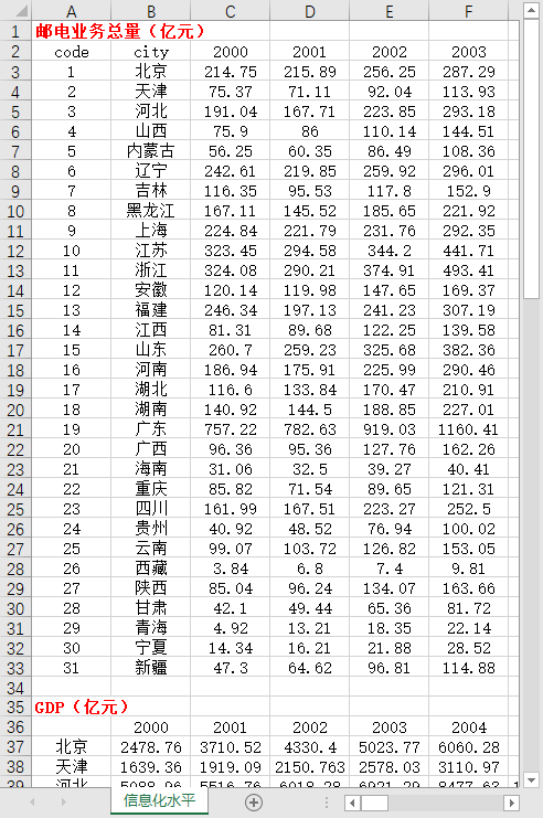 分别包含:邮电业务总量(亿元)、地区生产总值GDP、邮电业务总量/地区生产总值GDP比