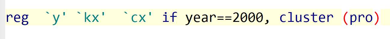 reg `y' `kx' `cx' if year==2000, cluster (pro)<br>