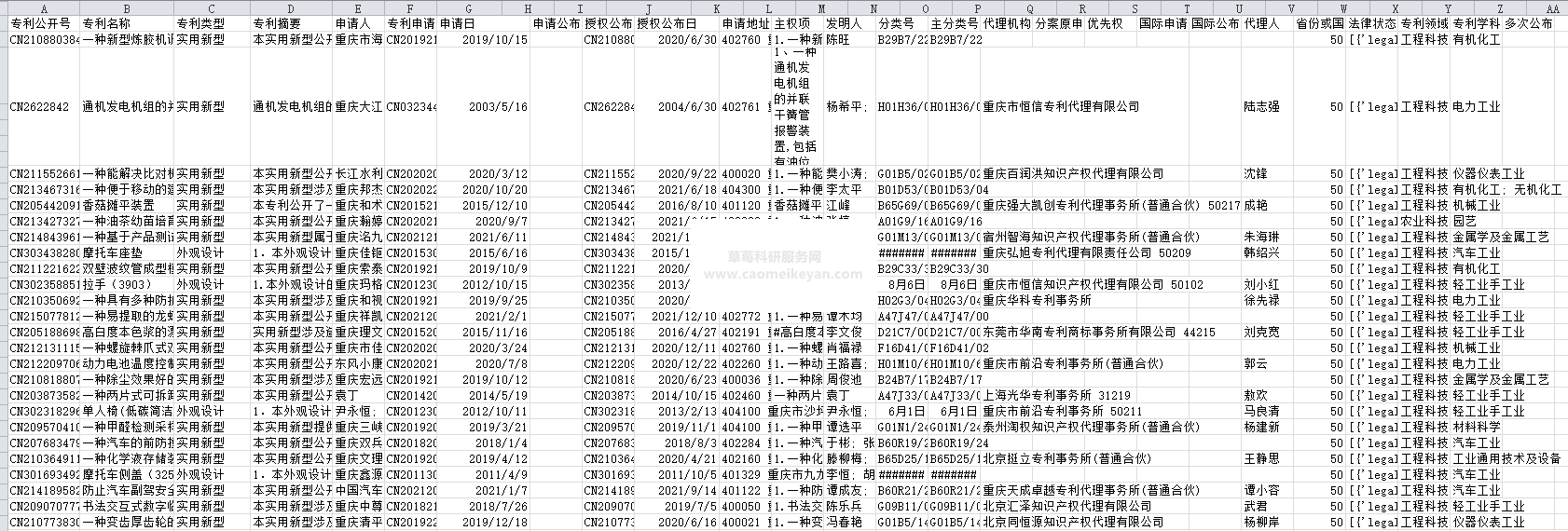 2.数据指标:专利公开号、专利名称、专利类型、专利摘要、申请人、专利申请、申请日、申请公布、授权公布、授权公布日、申请地址、主权项、专利类型、发明人、分类号、主分类号、代理机构、分案原申优先权、国际申请、国际公布、代理人、省份或国家代码、法律状态、专利领域、专利学科、多次公布( v% ?3 F1 H' M& h& U0 M