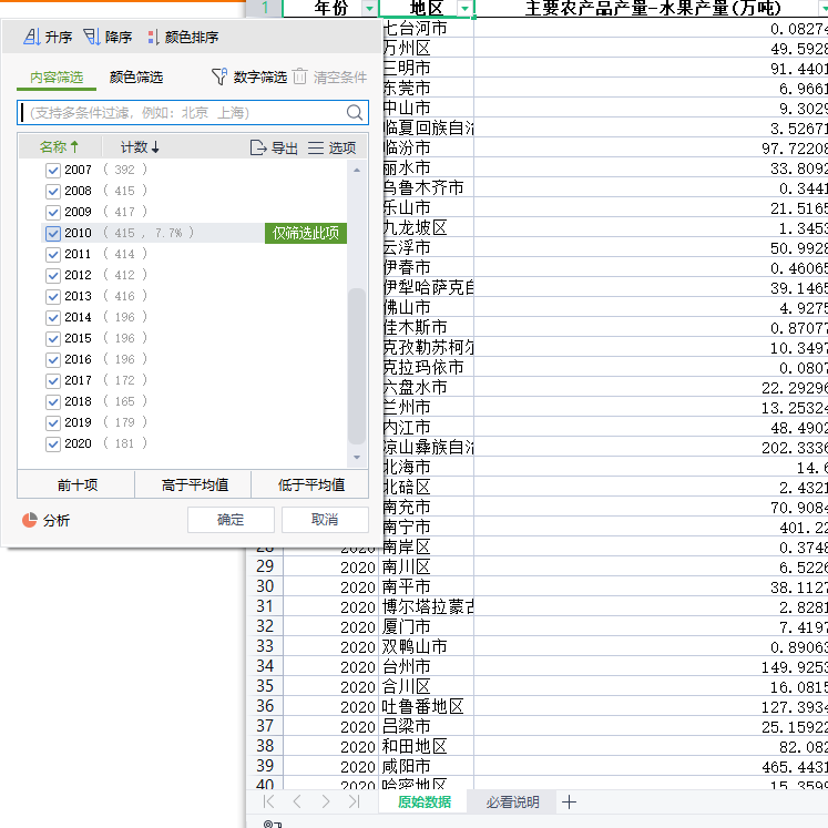 一、数据介绍数据名称:全国各城市地级市主要农产品产量-水果产量