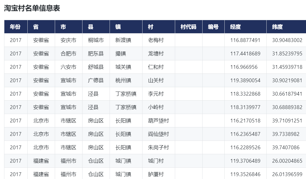 淘宝村淘宝镇名单数据梳理形成了“淘宝村”和“淘宝镇”名单数据,名单中相关信息依据《中华人民共和国乡村振兴促进法》和国家统计局《2021年统计用区划代码和城乡划分代码》中有关城乡划分标准,共有淘宝村和淘宝镇两个信息表,包含省、市、区县、村、经纬度等关键字段。