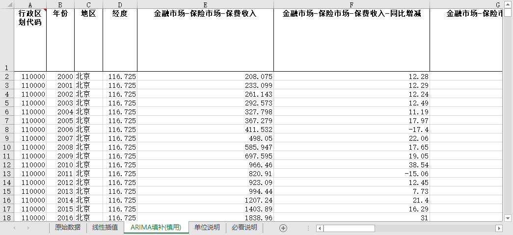 主要数据变量:行政区划代码 年份 地区 经度 金融市场-保险市场-保费收入 金融市场-保险市场-保费收入-同比增减 金融市场-保险市场-财产保险 金融市场-保险市场-财产保险-同比增减 金融市场-保险市场-人身保险 金融市场-保险市场-人身保险-同比增减