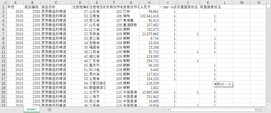 分别增加了:yidaiyilu国家标志、东盟国家标志、欧盟国家标志(1代表是,空白代表不是),便于您不同场景的统计分析利用