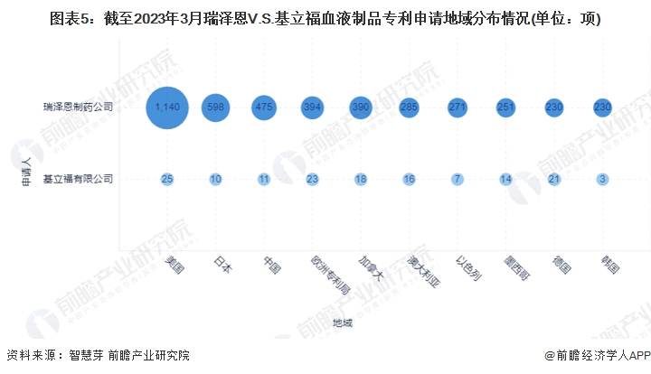目前,瑞泽恩与基立福血液制品专利申请区域主要集中在美国,分别为1140项与25项,其次为日本,分别为598项与10项。
