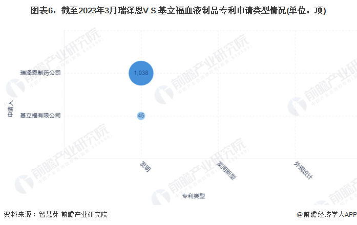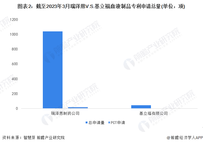 在血液制品专利申请量方面,瑞泽恩制药公司血液制品专利申请总量远超于基立福有限公司,分别为1038项和45项。