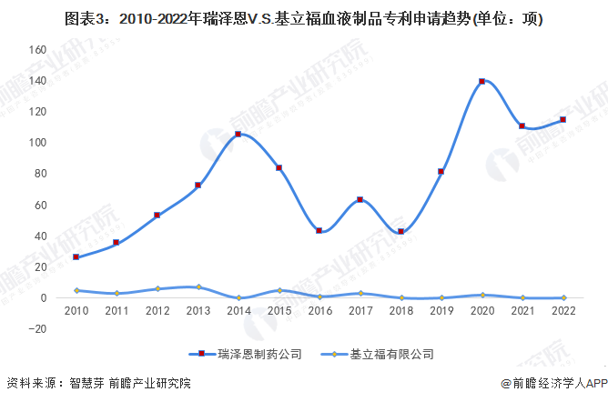 从趋势上看,2010-2022年,瑞泽恩在血液制品领域专利申请量远超基立福,2022年,瑞泽恩血液制品专利申请量为114项,基立福专利申请量为0项。