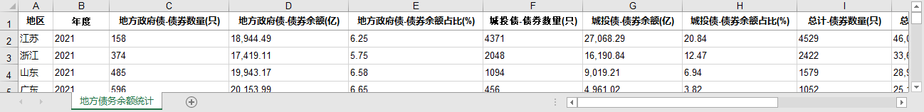 • 地区 年度 地方ZF债-债券数量(只) 地方ZF债-债券余额(亿) 地方ZF债-债券余额占比(%) 城投债-债券数量(只) 城投债-债券余额(亿) 城投债-债券余额占比(%) 总计-债券数量(只) 总计-债券余额(亿) GDP 公共财政收入 公共财政支出 债务负担(%) 负债率(%) 财政自给率(%)