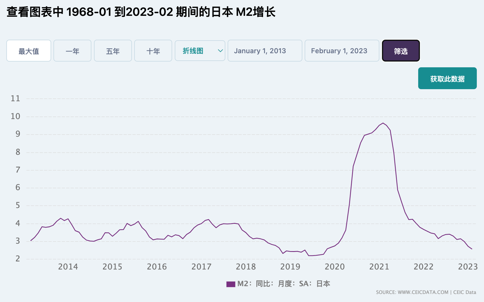 但是日本在近十年间的M2增长,剔除新冠疫情期间的非常规操作,基本都没有超过4.5%,甚至经常处于3%附近及以下,而对比同期中国的M2增长,同样剔除新冠疫情期间的非常规操作,基本都没有低过8%。