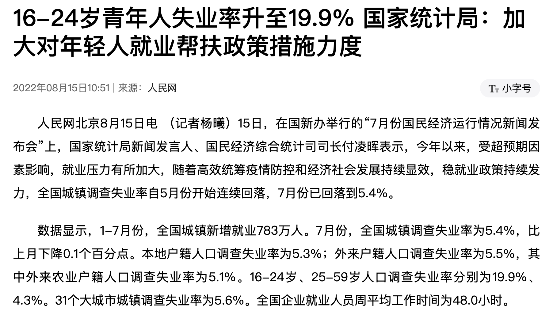同时,大量市场主体因为过剩产能泡沫破灭而退出市场后,同时会导致真实失业率的上升,近期不断出现的“考公务员更加火热”、“上海某大学毕业生就业率创历史新低”等新闻,无一不在预示着即将到来的失业潮,或许2022年国家统计局发布的年轻人失业率19.9%只是一道开胃菜。