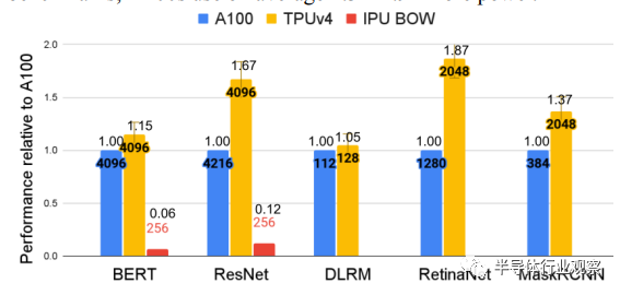 据他们在一篇博客中介绍,得益于互连技术和领域特定加速器 (DSA) 方面的关键创新,谷歌云 TPU v4 在扩展 ML 系统性能方面比 TPU v3 有了近 10 倍的飞跃;与当代 ML DSA 相比,提高能源效率约 2-3 倍。在与Nvidia A100 相比时,谷歌表示,TPU v4比前者快 1.2-1.7 倍,功耗低 1.3-1.9 倍。在与Graphcore的IPU BOW相比,谷歌表示,其芯片也拥有领先的优势。