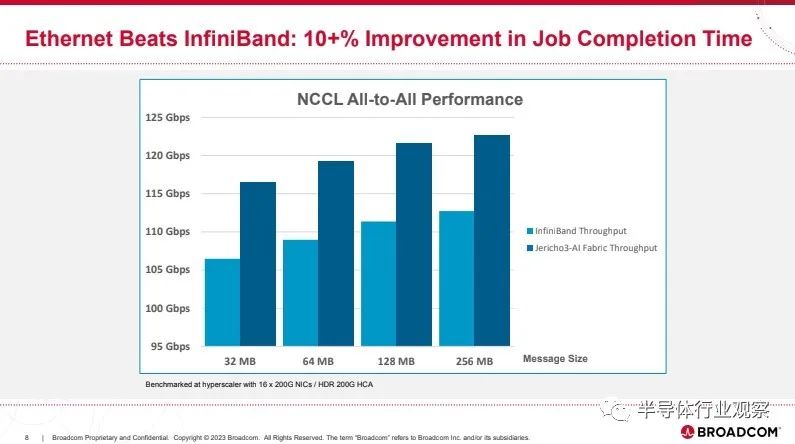 尽管如此,Broadcom 表示其 Jericho3-AI 以太网在 NCCL 性能方面比 NVIDIA 的 Infiniband 好大约 10%。