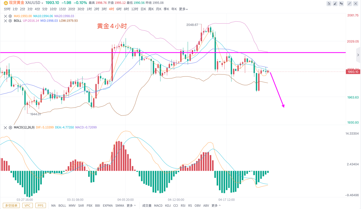 如图,黄金价格受加息情绪的影响,出现一波下跌至1970美元/盎司的位置,上方还是依托2015美元的防守位置,继续保持向下的走势,只是这个下跌的过程中会一波三折,不断出现多头反扑,但只要守住2015美元/盎司的高点,那么短线价格的走势仍将继续保持回落,可能会延续至美联储加息落地的前锋,没有揭晓答案之前,市场还是以情绪影响为主,今天反弹2000-2000美元附近也就是4小时boll中轨,继续保持短线空头思路!