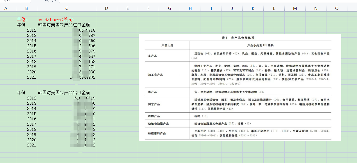 韩国过对美国农产品进出口数据,含原始数据,及整理的每年汇总金额面板数据