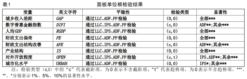 运用常用的五种面板单位根检验方法,检验数据平稳性,所有变量都基本通过了平稳性检验,可以视为平稳序列。
