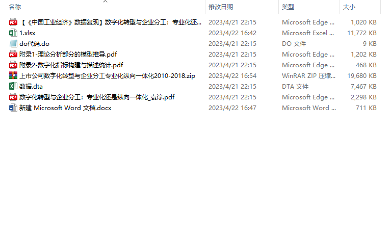 证券代码 年份 母公司省份 母公司城市 行业代码 企业专业化程度 数字化相关词汇的频数 企业数字化程度 企业规模 资产负债率 现金持有量 产权性质 总资产收益率 市值账面比 资本密集度 子公司数量 市场化程度 经济发展水平 互联网普及率 上一年全国互联网上网人数*1984年各地级市每万人固定电话数量 2001-2009年各省互联网普及率 “宽带中国”哑变量 VSI1 VSI2 VSI3 VSI4 云计算 互联网 人工智能 大数据 物联网 ind_adj 在样本期受过处罚为1 深交所信息质量考评结果(1优秀2良好3合格4不合格) 无形资产/总资产 行业契约密集度 管理费用/营业收入 在职消费/营业收入 销售收入增长率 全要素生产率 st ln(词频+1) 固定资产密集度 第一大股东持股比例 高管是否持股 高管薪酬 上市时间 内部控制指数 制造业 服务业 管制性行业取0,竞争性行业取1 group(province) digital_adj digital_std digital_pca Residuals H_IA digital_H_IA H_Contract digital_H_Contract L_MktIndex digital_L_MktIndex L_MgtCost digital_L_MgtCost L_Perk digital_L_Perk H_Growth digital_H_Growth 企业专业化程度 数字化相关词汇的频数 企业数字化程度 企业规模 资产负债率 现金持有量 产权性质 总资产收益率 市值账面比 资本密集度 子公司数量 市场化程度 经济发展水平 互联网普及率 上一年全国互联网上网人数*1984年各地级市每万人固定电话数量 2001-2009年各省互联网普及率 全要素生产率 digital_adj digital_std digital_pca H_IA digital_H_IA H_Contract digital_H_Contract L_MktIndex digital_L_MktIndex L_MgtCost digital_L_MgtCost L_Perk digital_L_Perk H_Growth digital_H_Growth