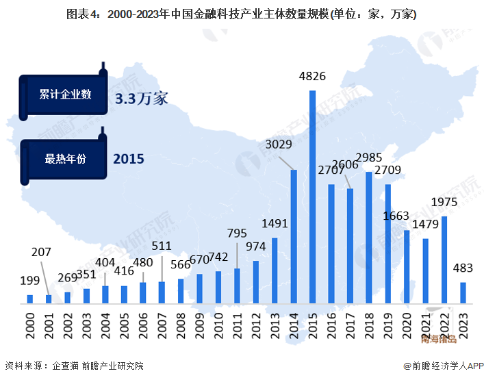 根据企查猫数据,通过在企业名,品牌/产品,经营范围,企业简介四个方面筛选关键词“金融科技”,并选定信息传输、软件和信息技术服务业以及金融业。截至2023年3月9日,我国金融科技产业主体数量规模约为3.3万家,其中注册主体最热的年份为2015年,新增企业数量达到4826家。