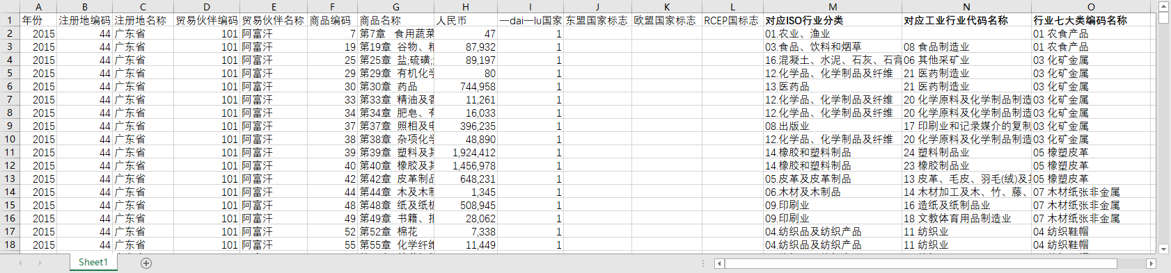 分别增加了:yidaiyilu国家标志、东盟国家标志、欧盟国家标志、RCEP国家标志(1代表是,空白代表不是),