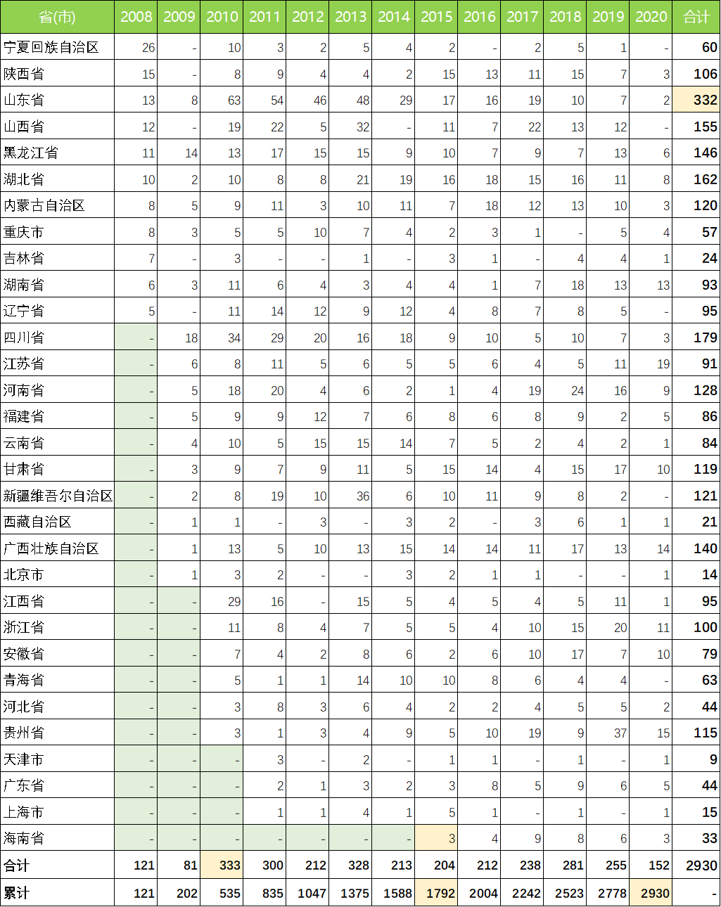 图表3:2008~2020年“农产品地理标志”品牌时间、空间演变数据