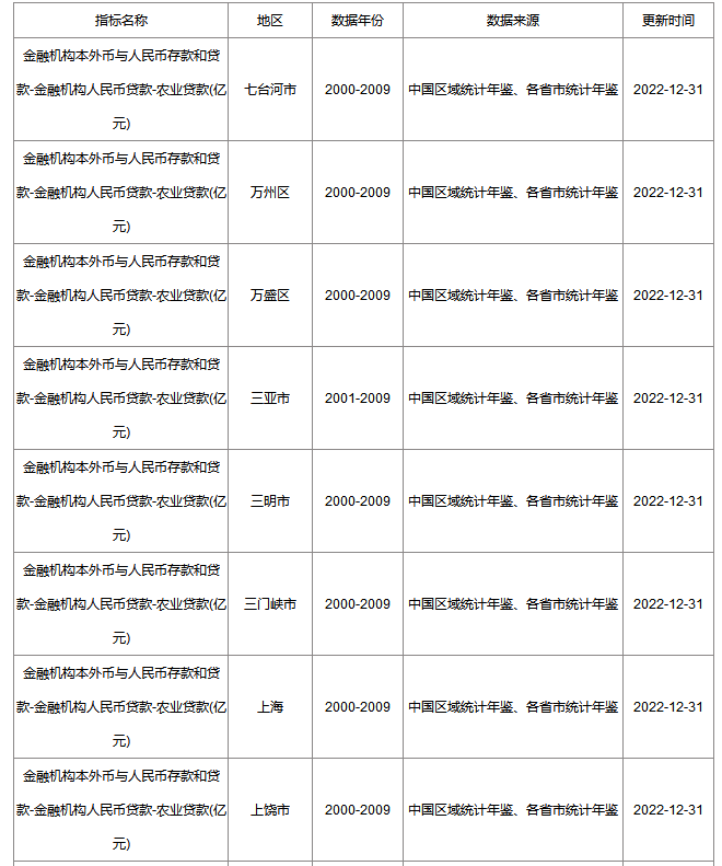 1、数据源名称:全国金融机构本外币与人民币存款和贷款-金融机构人民币贷款-农业贷款