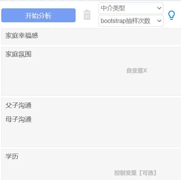 在SPSSAU系统中,【问卷研究】->【中介作用】,操作如下图: