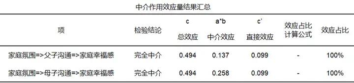 本次分析共1个自变量X,2个中介变量M,共有12=2条中介路径。ab的95%BootCI均不包含0,说明中介效应显著,检验结论显示,2条中介路径为完全中介作用(a和b显著,且c’不显著,为完全中介)。完全中介作用说明X会全部通过中介变量M去影响Y。即家庭氛围会全部通过父子沟通和母子沟通影响家庭幸福感。