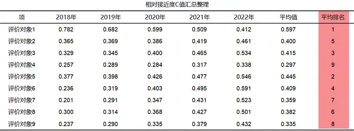 筛选年份后分别进行5次分析,将5年的相对接近度C值汇总整理如下表: