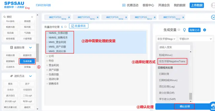 将正向指标“营业利润”、“资产总额”、“流动比率”使用SPSSAU进行正向化处理;将逆向指标“负债总额”、“销售成本”使用SPSSAU进行逆向化处理。