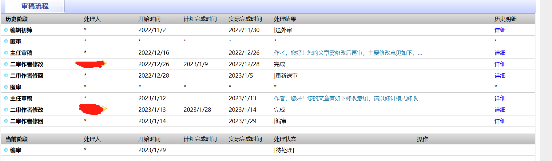 下边有投稿流程,编审那就一直没有变了,后边一直都是邮件、电话联系。差不多过了两个月,3月20几号开始邮件询问审稿,回复挺快的。四月初编辑部那边开始让我改(11.2-1.29-4.6),确认了几个小问题、删了字数什么的,4月19号改完了顺道问了下编辑部,说还在排期。昨天编辑那边在让确定一次,给的是样刊了,下个月出。投稿到出来(11.2-5)差不多半年。这期刊编辑这些都很好,沟通顺畅,编辑部电话也能打通(打了三四个吧,邮件也发了几个哈哈)。