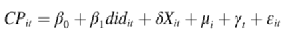 在控制城市固定效应和时间固定效应后运用DID回归得到的结果如下表所示。其中,模型(1)是仅控制关键自变量的结果,模型(2)是控制所有变量的完整结果。