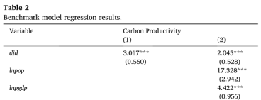 结果显示,did变量的估计系数在1%的水平上具有统计学意义。这表明智能城市试点政策确实提高了城市的碳生产率。在加上额外的控制变量,本文发现lnpop很有意义,说明人口规模的扩大可以提高碳生产力。虽然人口增长促进了碳排放,但也可能导致更快的经济增长。